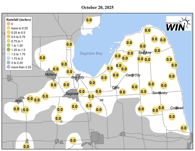 Daily Rain MapThe rain map displays daily rainfall amounts. A user can hover the cursor over a rainfall value to yield the corresponding station name, and clicking on the rainfall value will display a table of daily temperature and rainfall totals. Daily rainfall data is calculated from the total accumulation of precipitation that falls from midnight to midnight. |