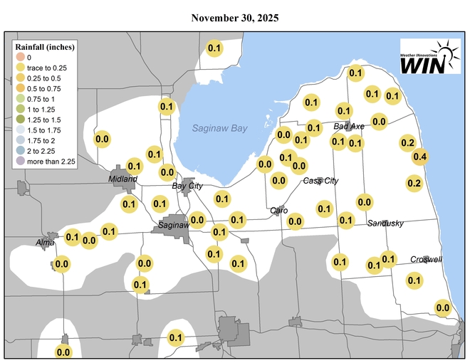 Daily Rain MapThe rain map displays daily rainfall amounts. A user can hover the cursor over a rainfall value to yield the corresponding station name, and clicking on the rainfall value will display a table of daily temperature and rainfall totals. Daily rainfall data is calculated from the total accumulation of precipitation that falls from midnight to midnight. Rain Maps have ended for the season and will begin again on April 1st. |